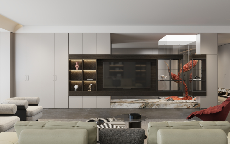 奶白色背板搭配深色開放格,輕松打造高級感電視背景墻;底部懸空放置植物與擺件,讓業主在閑暇之余,感受到空間帶來的呼吸感。