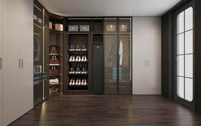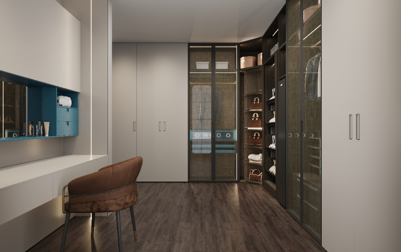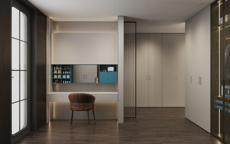 衣帽間設置梳妝臺,模塊化功能分區,秩序井然,兼具實用性與視覺美,新穎別致的開放格設計,滿足Amy放置常用的護膚化妝品。