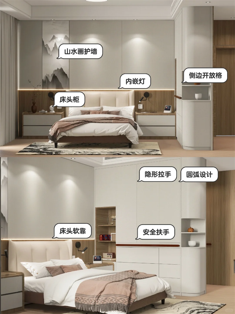 ??床頭護墻板融入山水畫,更符合爸媽審美,裝內嵌感應燈,方便夜間起床。