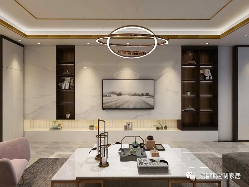 玄關左邊即是客廳電視背景墻,漢白玉點綴黑澤明,