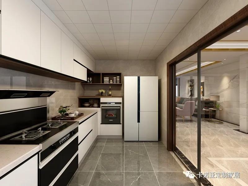 廚房與餐廳相連,中間采用玻璃推拉門隔開,