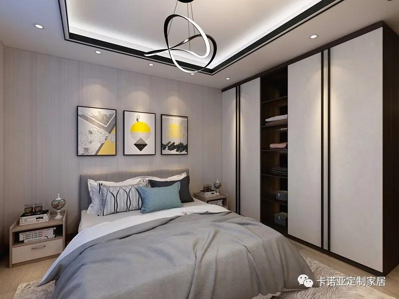 主臥選用了入墻式的開門衣柜,容量大,造型美觀整體。淡灰色的墻面與床品的灰色系呼應整體的黑白色調,