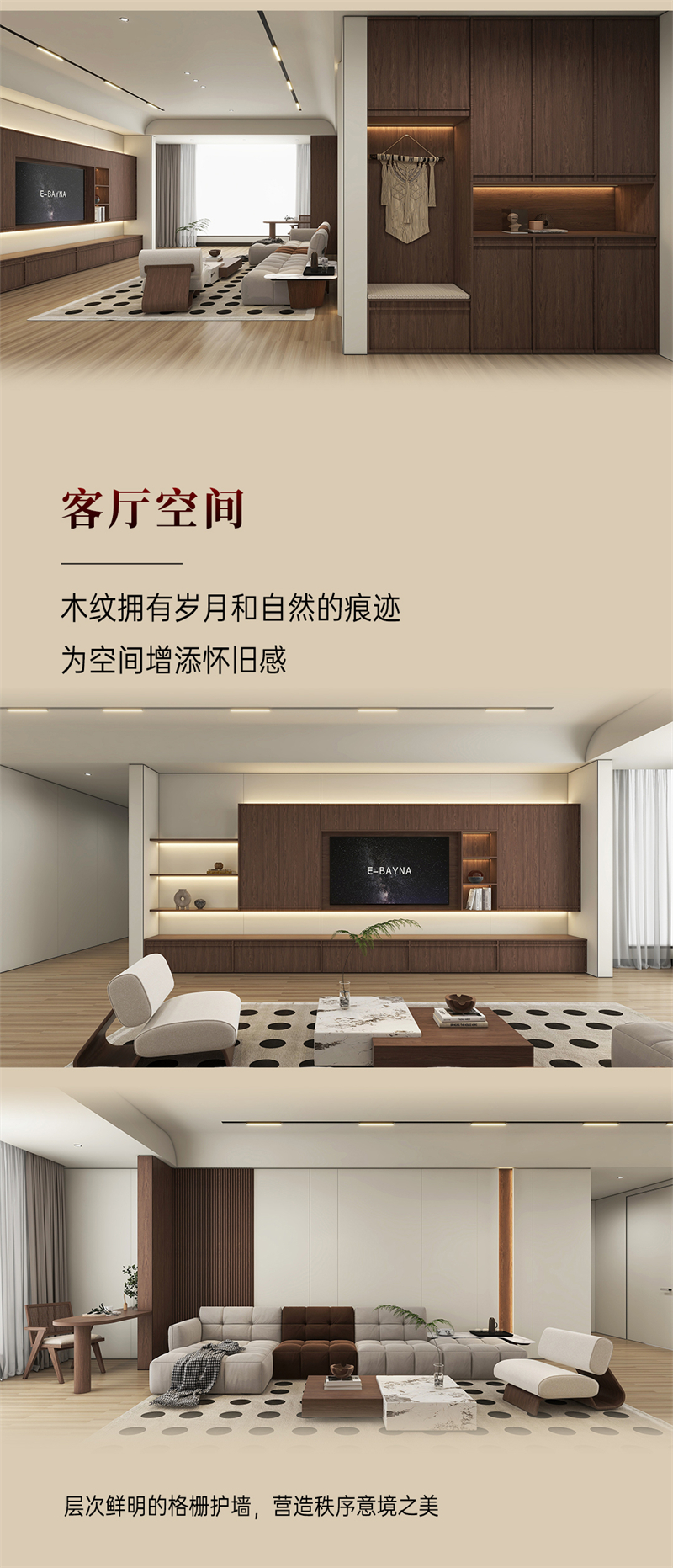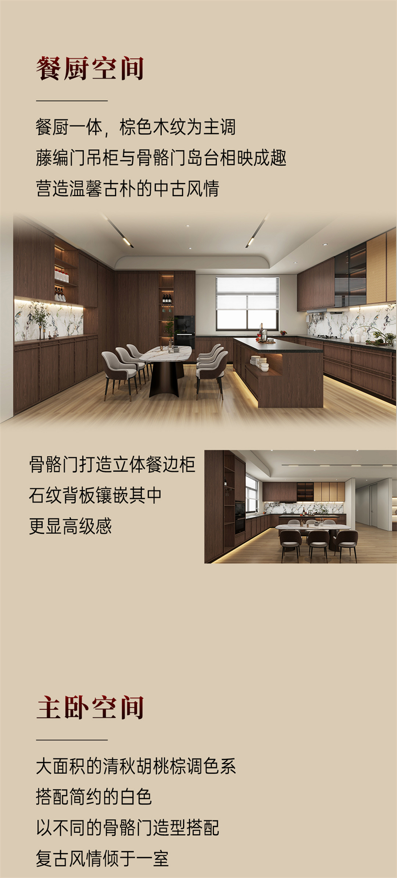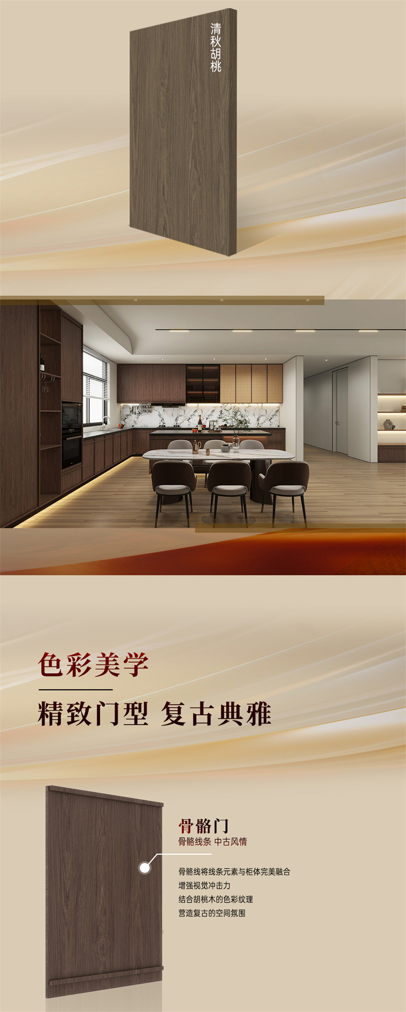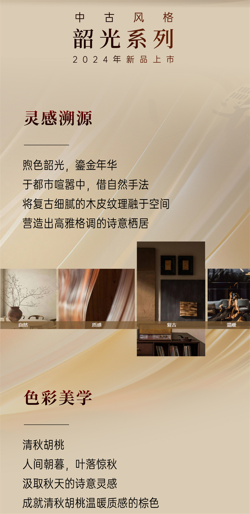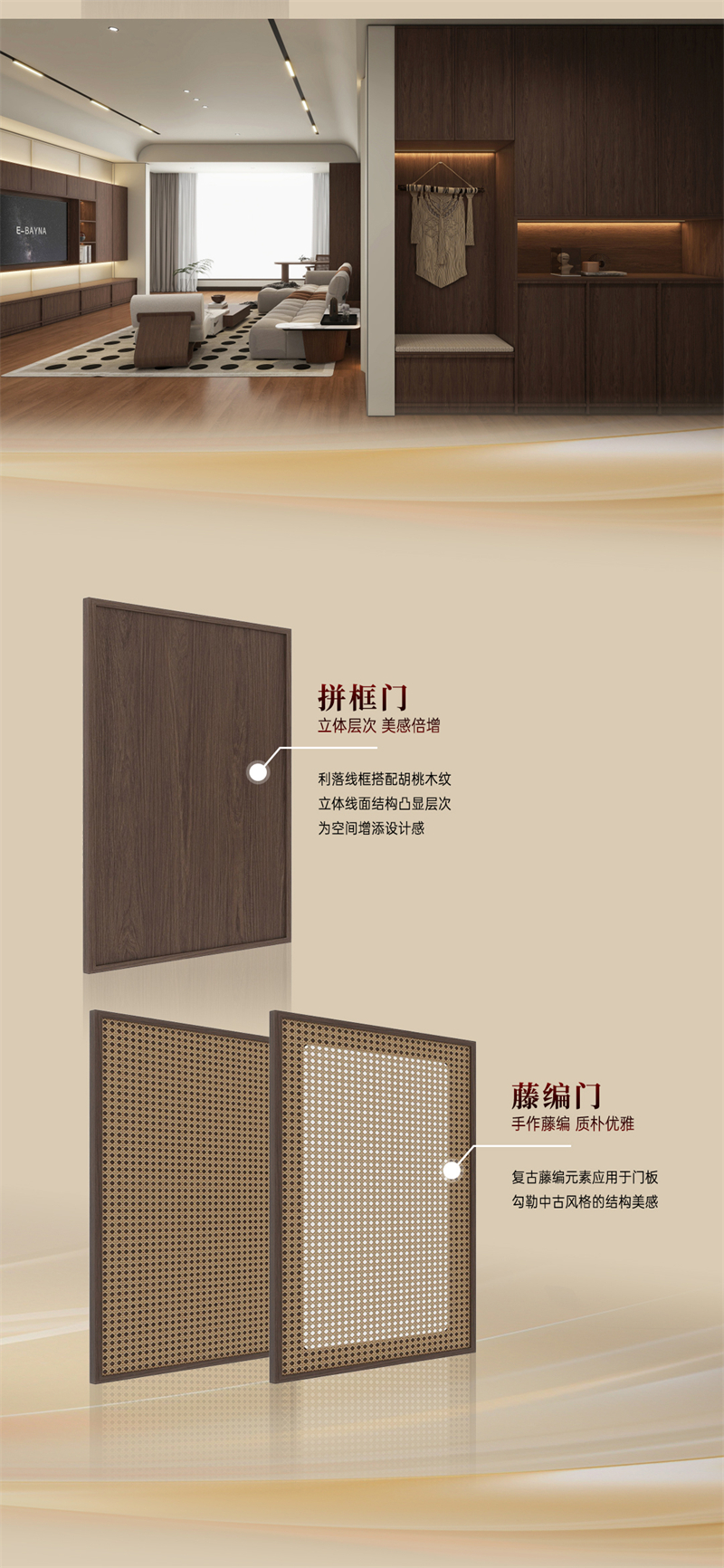 2024年新品系列,韶光 |中古風棕色胡桃木紋為主色調,搭配白色暗紋,細膩的藤編門與硬朗的骨骼門讓人聯想到古老的家具,充滿了歲月的痕跡。木紋的邊框+細密的藤編,自帶復古朦朧美感;拼樞門和藤門結合運用,使整個空間透氣感強,并擁有獨特舒適的慵懶氛圍。