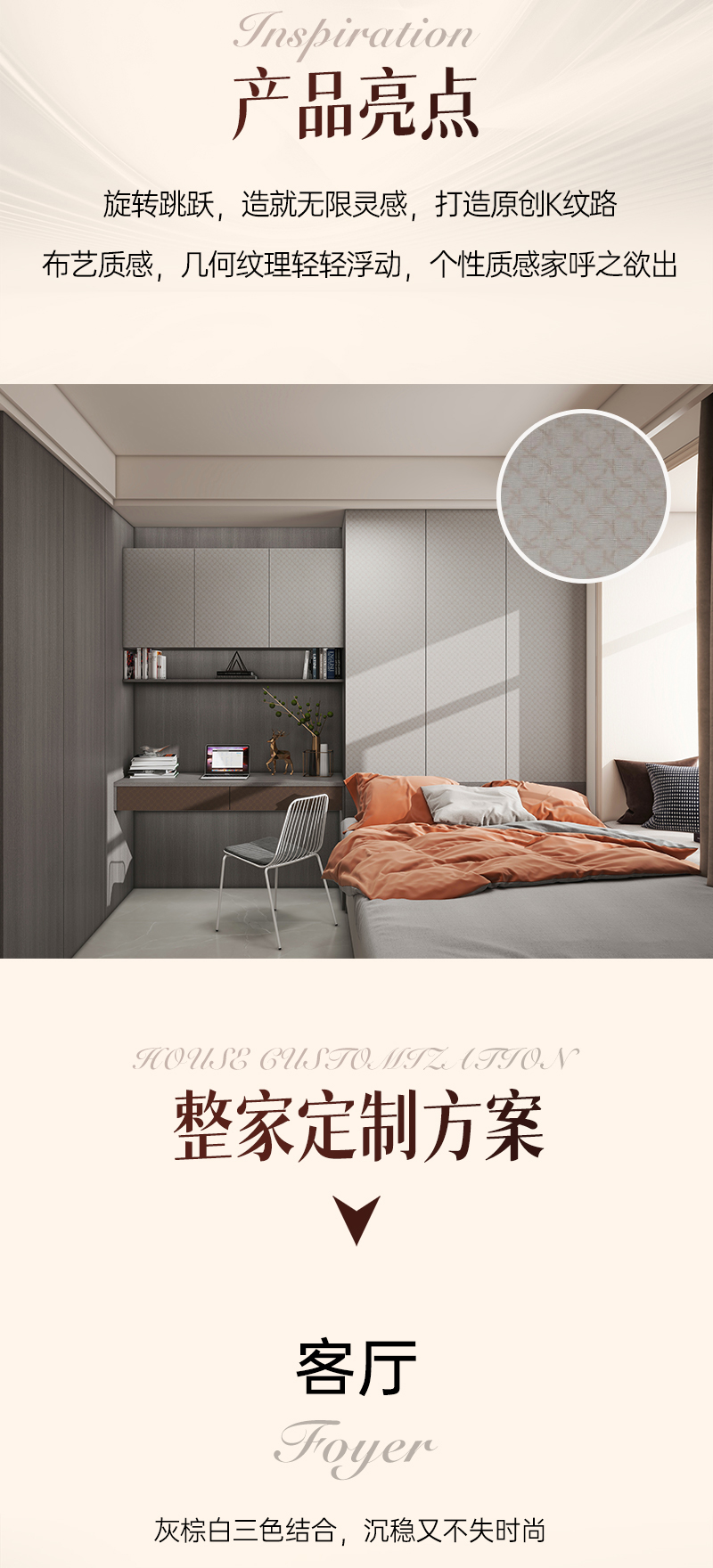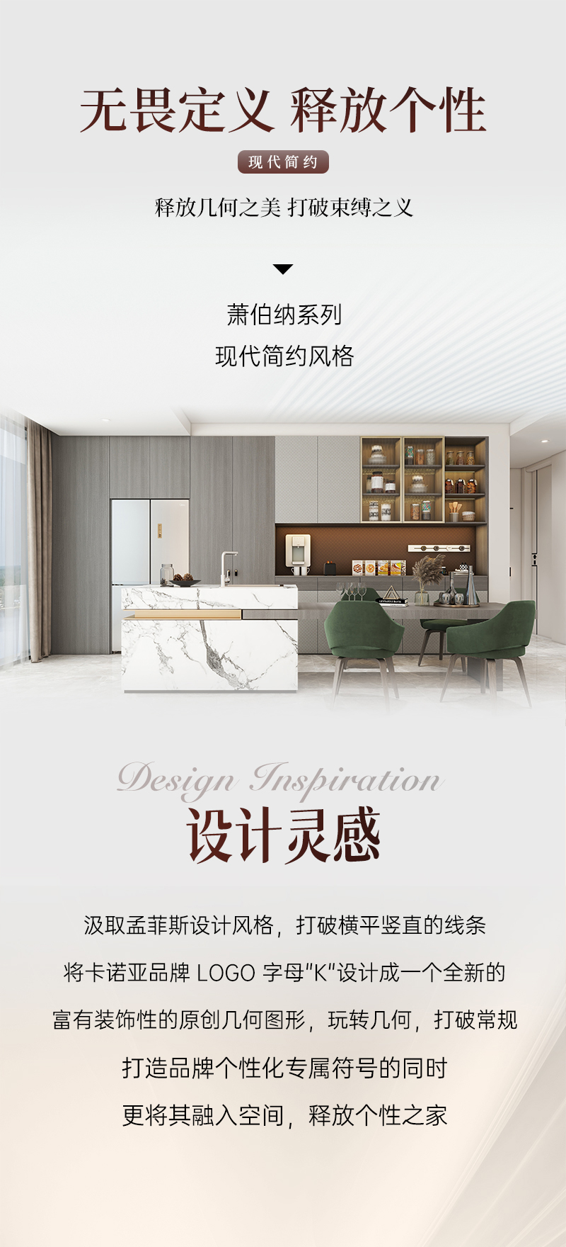 蕭伯納系列 | 現代簡約風格汲取孟菲斯設計風格,打破橫平豎直的線條,將卡諾亞品牌 LOGO 字母"K"設計成一個全新的富有裝飾性的原創幾何圖形,玩轉幾何,打破常規,打造品牌個性化專屬符號的同時,更將其融入空間,釋放個性之家。