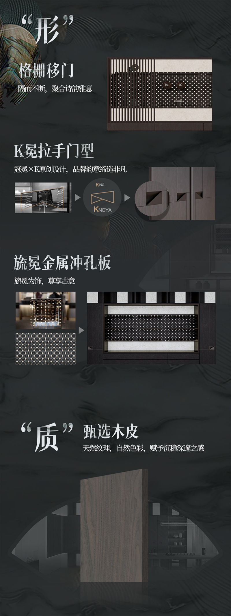 藏玉系列以“形、質、氣、韻、神”的五重境界,以小見大、步移景異,串聯式的節點打造層次遞進的空間情緒。從歸家禮儀、空間格局以及設計細節等多個維度,建構禮序雅境。
