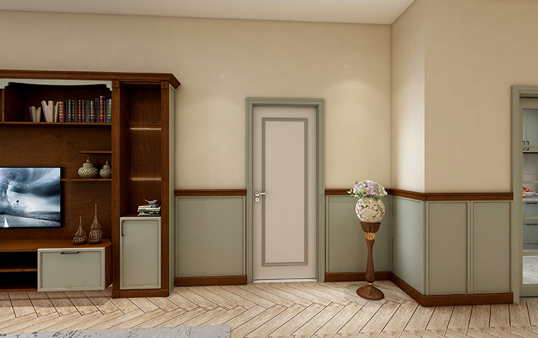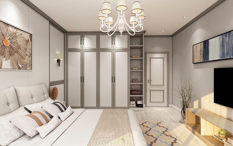 免漆門以白色為空間主色調,輔以灰色立體框線點綴,讓木門的視覺帶有簡歐的風情。到頂衣柜與同色木門交相輝映,整體空間寧靜素雅,簡歐特有的細膩、溫柔與端莊如涓涓細流,沁入人心。
