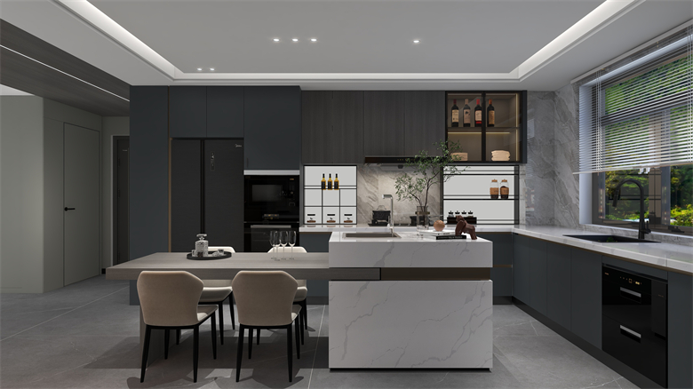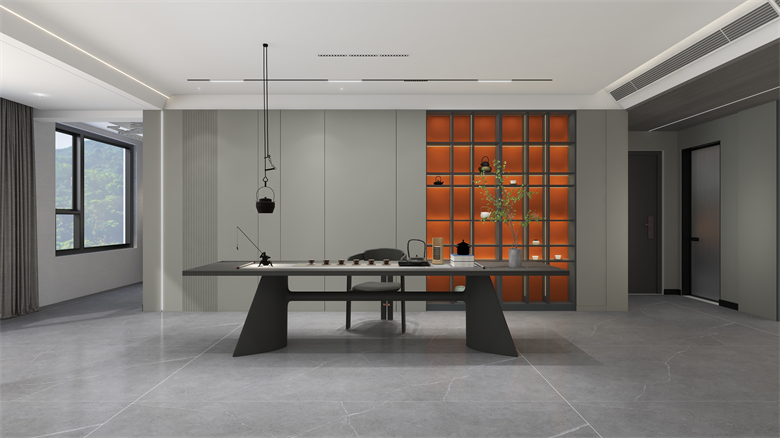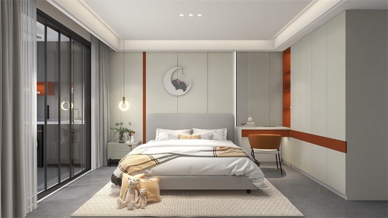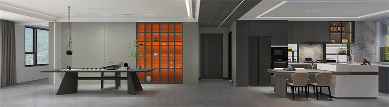 本案以現代極簡風,采用黑白灰的色彩基調,三色過渡簡單自然,彼此映襯,讓人置身于一種靜謐的家居氛圍。空間中的橙色點綴,仿佛一術光,照亮了整個黑暗,生活需要光的指引,只要我們不斷追逐,光永遠在我們前方!