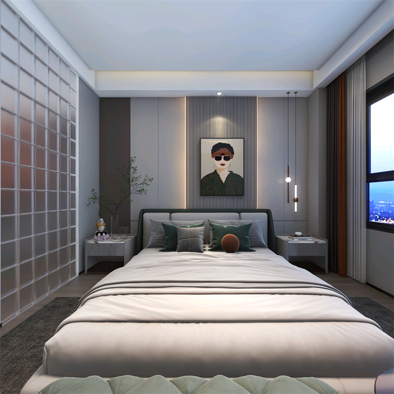 此案,為現代極簡風格,整體以簡單大氣,穩重不失溫馨,設計上嚴格遵循人體工程學原則,在造型、材質等方面要符合人的生理和心理需求。此案設計的色彩比較單一,顏色多選用單色,或少數幾種顏色搭配。避免使用多種顏色混搭以及避免使用強烈對比的顏色,復雜華麗的顏色,反對繁瑣的花紋色彩的搭配。在色彩上追求平和、舒緩、內斂之感極簡主義的設計多采用直線、方形,或規則簡單的幾何形狀,減去一切不必要的元素與細節,比例精確,整體呈現簡潔明快,干凈利落感覺。此案中大部分空間運用了無主燈,因為無主燈設計講究的是“見光不見燈,分區域散點照明”。而且的無主燈設計能夠讓空間更具層次感,顯得非常的高級,若隱若現,層次分明。
