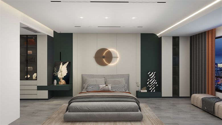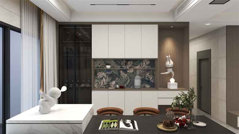 (3)空間簡約,色彩就要跳躍出來,銀絲木、雅杏、 玲蘭綠、澀黑等色彩大量運用,大膽而靈活,不單單是對簡約風格的遵循,也是個性的展示。