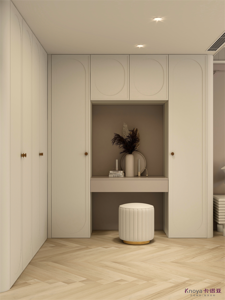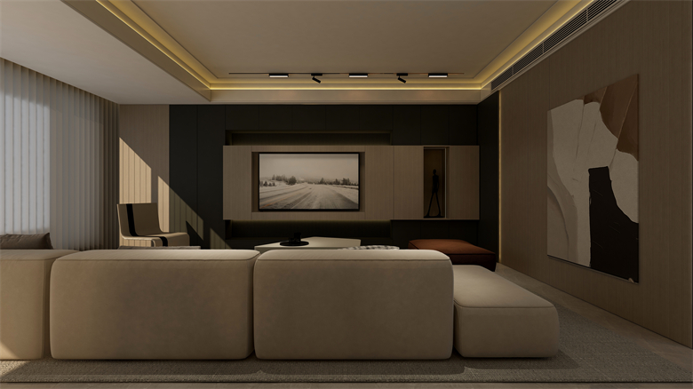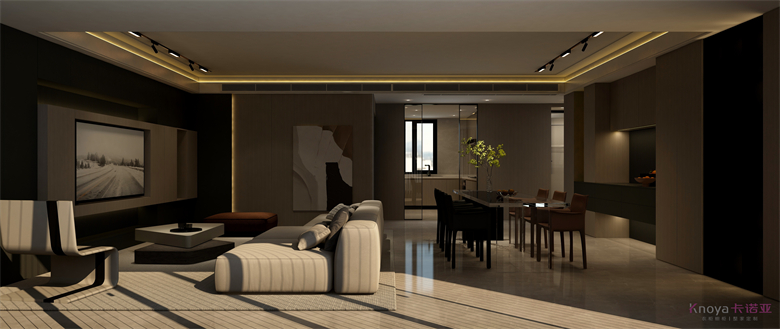 本案設(shè)計(jì)圍繞業(yè)主意式極簡風(fēng)格的需求,主色調(diào)黑、白、灰、咖,多利用金屬色、木色、石材做出變化,點(diǎn)綴少量艷麗色。柜墻門一體化,采用穿插、進(jìn)退等設(shè)計(jì)手法,配合燈光使空間簡潔又頗具設(shè)計(jì)美感。意式極簡風(fēng)格刪繁就簡,遠(yuǎn)離一切浮華和不實(shí)用,從生活本質(zhì)出發(fā),以極簡的設(shè)計(jì)演繹出最本質(zhì)的輕奢美學(xué)。
