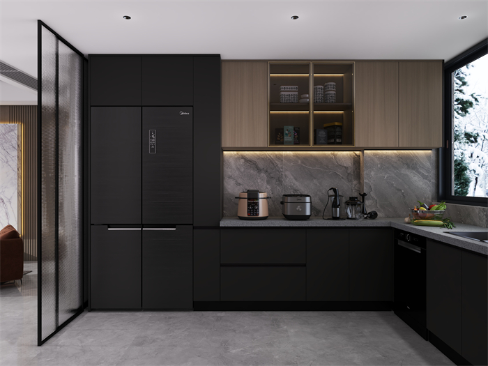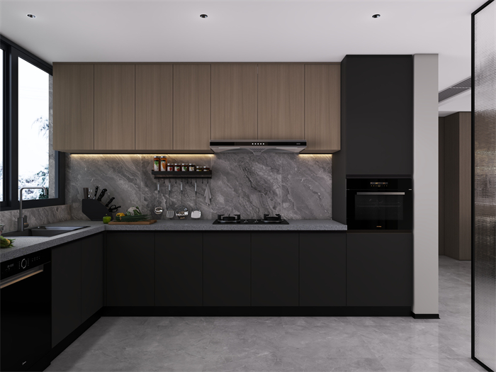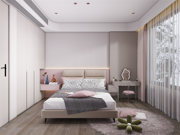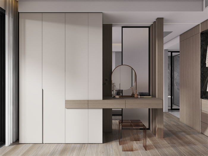 家具選擇上,以簡約現代風格的家具為主,注重舒適度和功能性。軟裝細節上,采用柔和的色彩和材質。廚房注重實用性和便利性,采用嵌入式收納設計,最大化利用空間,營造一個干凈整潔的烹飪區域。臥室以舒適為設計重點,采用柔和的色調和舒適的床品,營造令人放松的休息空間。充分利用儲物空間保持整潔有序。