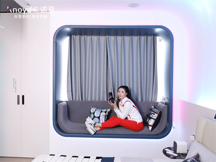 進入“樂在臥室”系列產品時,陳曉君禁不住坐在了卡諾亞專為活力青年設計的太空艙飄窗上,打開繽紛極光燈時,整個空間充滿了未來的科幻感,仿佛置身極地的星空下,美輪美奐,讓人充滿遐想。針對年輕人喜愛的潮流手辦,專門打造的展示柜,讓心愛的“它”有了歸屬。看到可升降電競桌,我們的體育明星也童心未泯,忍不住坐到電競椅上,敲打鍵盤,點擊鼠標,準備開黑呢!更讓陳曉君驚奇的是,這里還有一個隱藏式投影屏幕,躺在床上就可以看電影、看動漫,搭配床頭投影出水波紋的藍光,在場的人都沉浸在對浩瀚星際的幻想中。