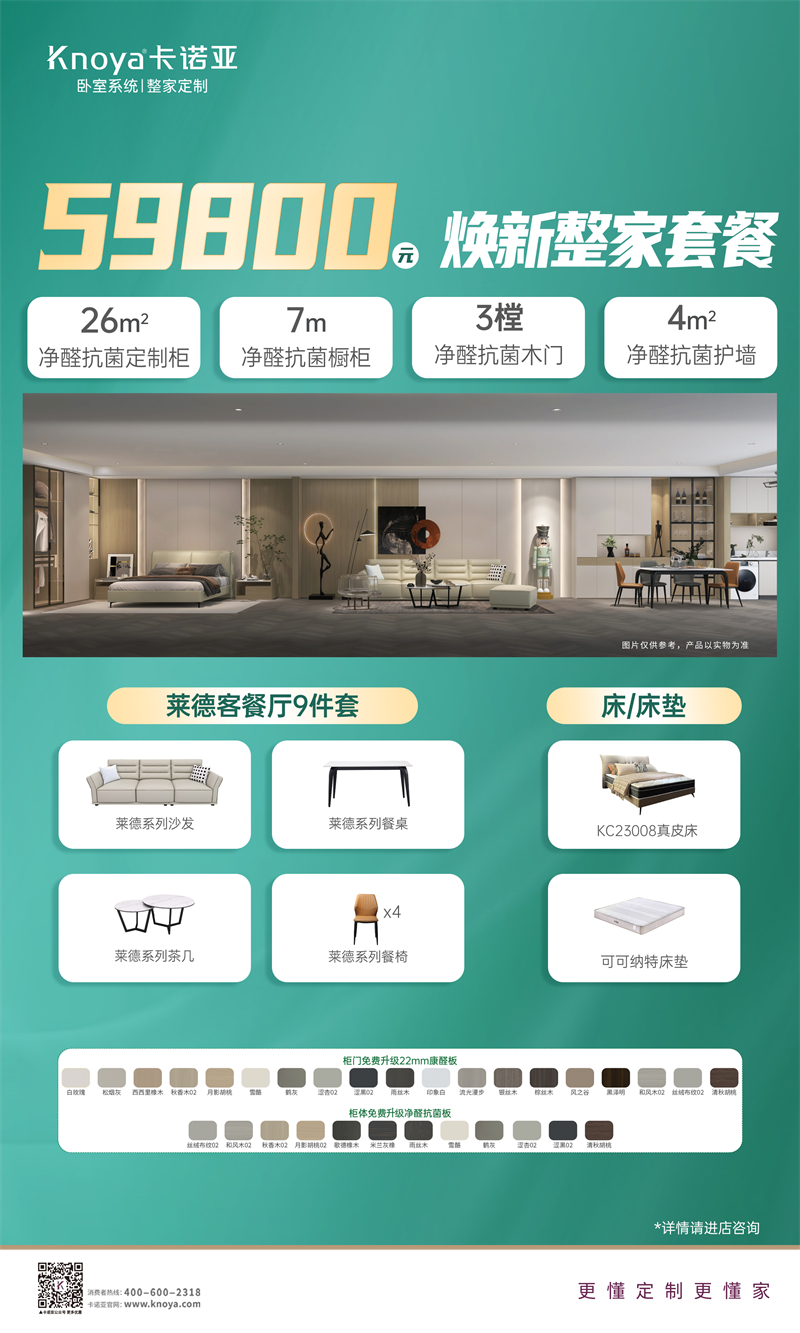 隨著國家新一輪“以舊換新”政策的深入推進,家居市場迎來新一輪消費熱潮。315消費者權益日+國補政策+品牌優惠的三重加持下,成為消費者更新家居、提升生活品質的絕佳時機。卡諾亞響應政策號召,于3月1日-31日開展“煥新 315·國補更優惠--政企雙補至高 20%”鉅惠活動,重磅推出59800元全屋升級凈醛抗菌家套餐、108000元全案整家套餐及系列臥室系統套餐,專為追求品質生活和改善型家裝的業主量身定制,為其提供更高端產品、更多大品牌、更高階體驗,以更優配的全案家居智能生活場景解決方案,輕松實現其家居煥新夢。