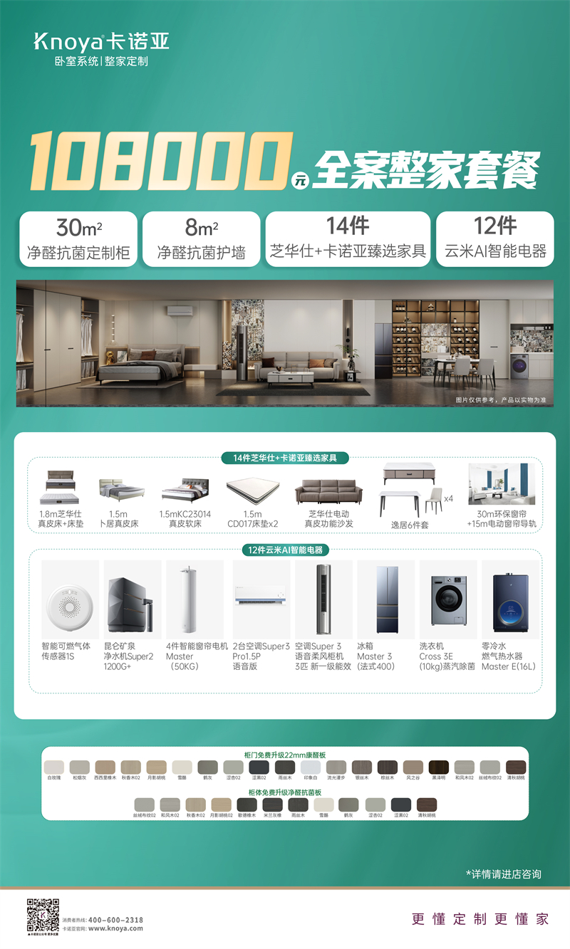卡諾亞此次315活動,攜手多個高端品牌如芝華仕、CBD、云米科技等,為消費者提供一站式的家居解決方案。活動期間,卡諾亞除了以上2大套餐,還精心推出32800元忙在臥室套餐、28800元享在臥室套餐、24800元學在臥室套餐等,涵蓋臥室系統+整家定制兩大品類,包括定制柜、護墻板、全屋家具以及智能家電,聯手更多大牌,真正實現“整家定制更高配,全屋家具更滿配,智能家電更全配”的理念。